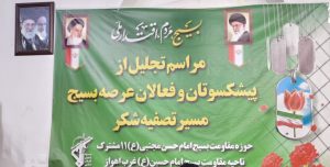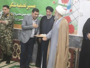 تجلیل از پیشکسوتان و فعالان عرصه بسیج مسیر تصفه شکر که با همت حوزه مقاومت بسیج امام حسن مجتبی(ع)به مناسبت هفته بسیج با سخنرانی حجت السلام والمسلمین حمیدی حوزه نمایندگی ولی فقیه در ناحیه امام حسین(ع)غرب اهواز